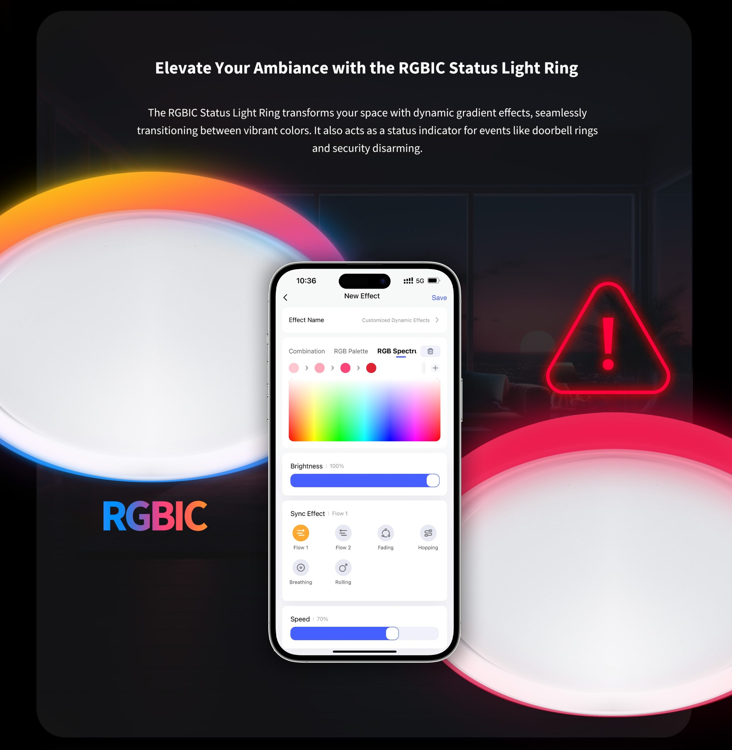 - RGBIC Status Light Ring: Users can use the side light for gradient lighting effects, and it can also function as a status indicator when connected to other smart home devices. For example, when another smart device detects an issue (like a leak or an open door), you can program the external light to show a specific colour. The integrated RGBIC side light can project captivating gradient effects, enhancing your room’s ambiance and sophistication with vivid colour transitions.