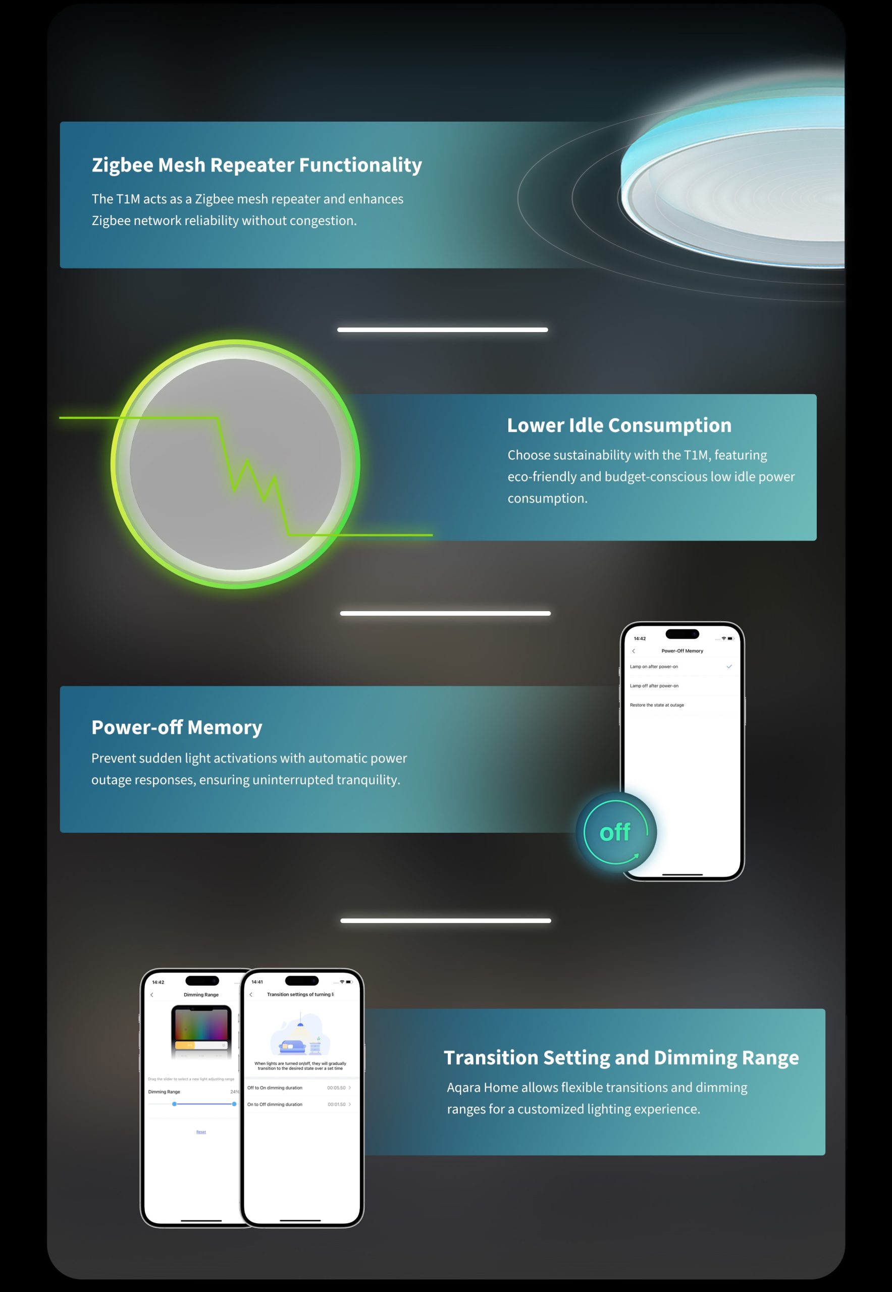 - Low Consumption and Easy Connection: Compared to the Wi-Fi competitors, the Light does not congest your smart home network. On the contrary, T1M acts as a mesh repeater, enhancing the reliability of your Zigbee network. Furthermore, it boasts significantly lower idle power consumption, making it both environmentally and budget-friendly.