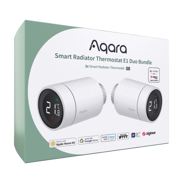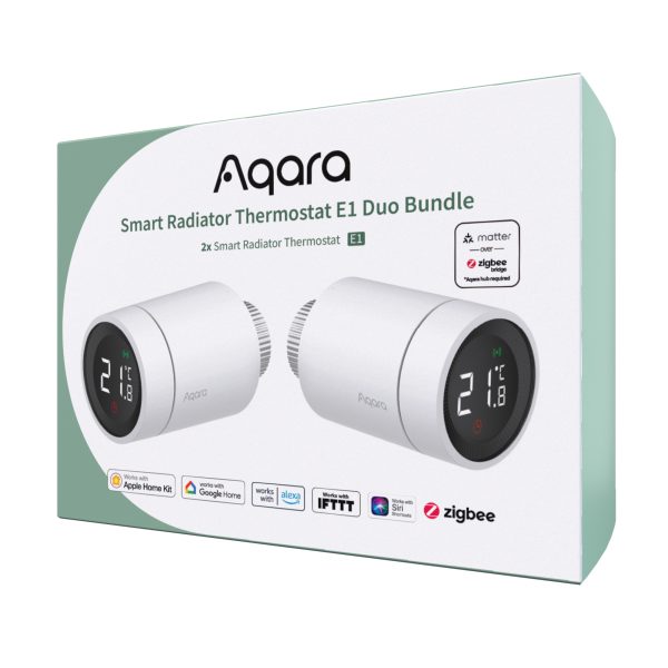 Enhance home heating efficiency with the Aqara Radiator Thermostat E1 Duo Bundle. Includes two E1 thermostats for precise temperature control. Zigbee 3.0 Protocol, HomeKit & Matter support, and compatibility with popular ecosystems. Efficient energy management, smart scheduling, and easy installation. Upgrade your heating system today!