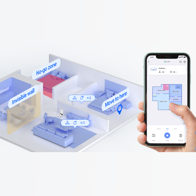 The RE4 Plus quickly maps your home and adapts to everyday changes like moved furniture or bags, ensuring a truly tailored cleaning experience. Use the EZVIZ app to adjust routes, edit floor plans, rename rooms, or even set up specific cleaning missions with ease.