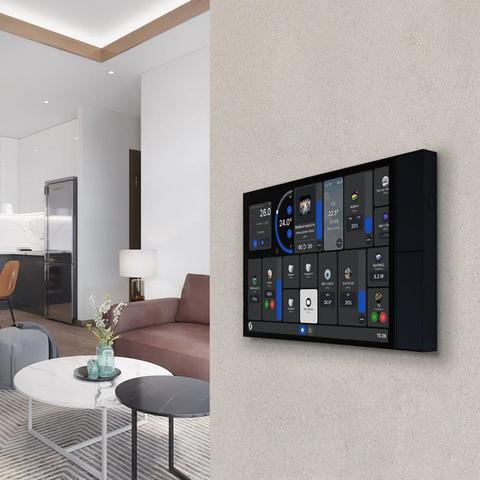 The Shelly Wall Display XL is a large smart wall controller featuring a 10.1″ touchscreen, built‑in relay control and four customisable physical buttons. It fits into a standard electrical wall box and connects to Shelly devices via Wi‑Fi and Bluetooth, giving you an easy, centralised way to manage smart functions across an entire building.